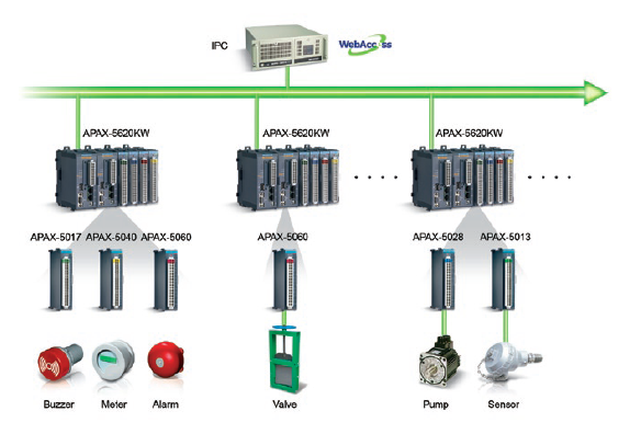 ▌▌系統(tǒng)總覽: 為了滿足Easy Control Technology的要求,研華為APAX-5620KW可編程自動化控制器(PAC)提供了各種APAX數(shù)字和模擬I / O模塊(包括APAX-5040,APAX-5060,APAX-5017和APAX- 5028),以建立一個(gè)冗余的系統(tǒng)架構(gòu)來監(jiān)控電閘和除砂設(shè)備。相同的配置還用于監(jiān)視電源系統(tǒng)中的發(fā)電機(jī)和配電面板。五個(gè)帶有APAX-5013 8通道RTD模塊的APAX產(chǎn)品可采集數(shù)據(jù)并控制泵,壓力,水位,流量,電動蝶閥等。對于這三個(gè)區(qū)域的數(shù)據(jù)采集和現(xiàn)場控制,核心是APAX- 5620KW控制器。其雙CPU模塊架構(gòu)獨(dú)立運(yùn)行,可提供高性能計(jì)算并執(zhí)行輸入和輸出控制任務(wù)。此外,冗余機(jī)制將I / O處理程序存儲在兩個(gè)獨(dú)立系統(tǒng)中的兩個(gè)控制器上。主控制器執(zhí)行I / O操作,當(dāng)主控制器發(fā)生故障時(shí),備用控制器將自動快速接管。這種獨(dú)特的雙控制器架構(gòu)為穩(wěn)定且不間斷的應(yīng)用提供了出色的可靠性。在建筑物的中央控制室中安裝了ATX主板AIMB-781,可機(jī)架安裝的ACP-4000機(jī)箱和研華WebAccess HMI / SCADA軟件。其易于使用的用戶界面為管理人員提供了動態(tài)圖形顯示和實(shí)時(shí)數(shù)據(jù)控制?;跒g覽器的軟件還允許地方和中央政府部門隨時(shí)遠(yuǎn)程監(jiān)視水產(chǎn)養(yǎng)殖生產(chǎn)區(qū)的狀況。此外,研華還提供了支持簡單網(wǎng)絡(luò)管理協(xié)議(SNMP)的EKI-4654R和EKI-7659C工業(yè)級交換機(jī)。通過這些高性能的以太網(wǎng)交換機(jī),該項(xiàng)目的現(xiàn)場硬件設(shè)備與控制室監(jiān)控系統(tǒng)無縫連接,以確保傳輸質(zhì)量。